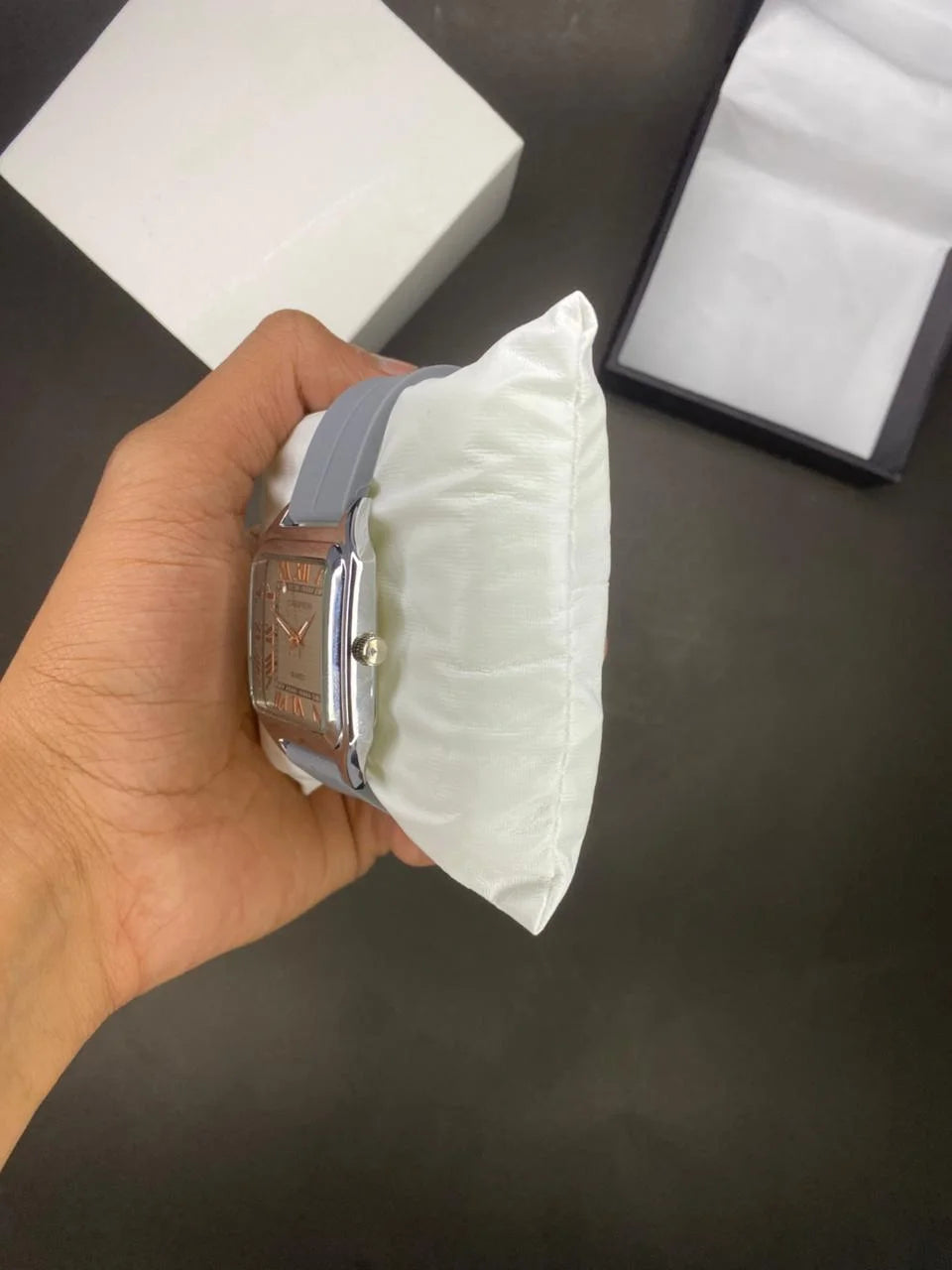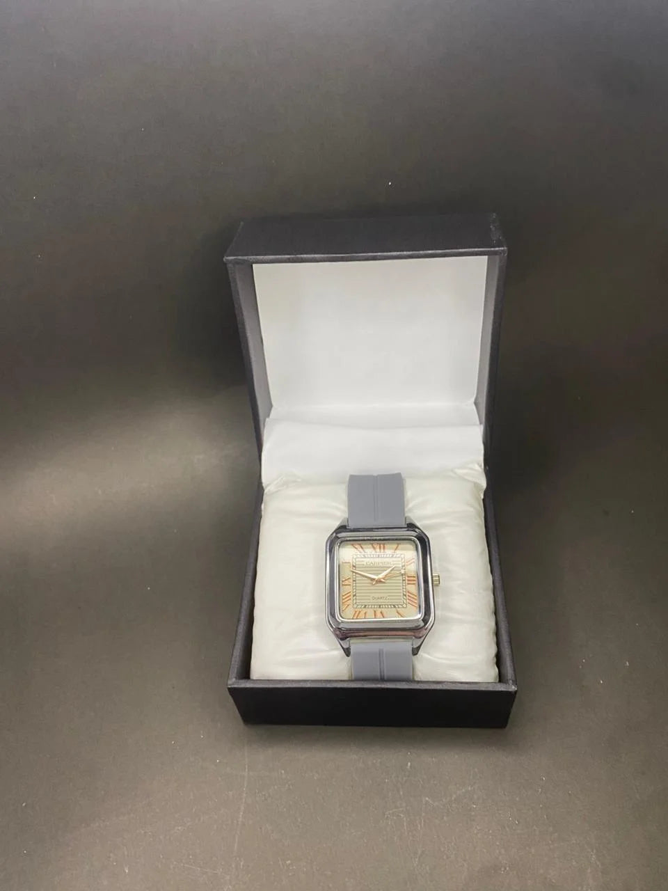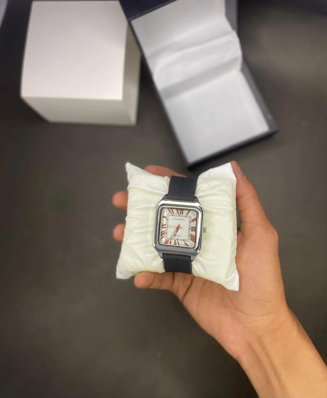 Shape/Pattern: Iconic Square Case with a textured cream dial